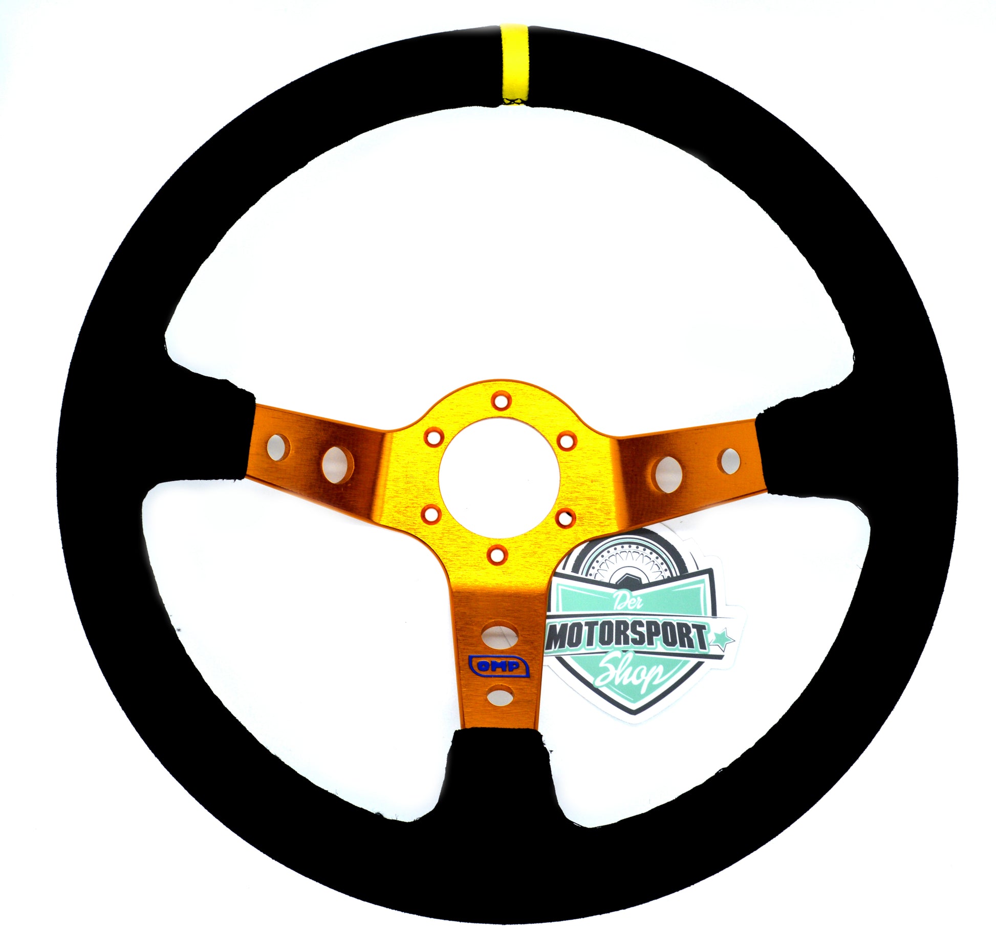 Das Lenkrad überzeugt mit schwarzem Wildleder, schwarzen Nähten und einer gelben Markierung zur schnellen Erkennung der Lenkradmitte. Der gold eloxierte Lenkradtopf setzt zudem einen besonderen optischen Akzent. Dank des 6x70 mm Lochkreises ist es mit den meisten Sportlenkradnaben kompatibel.